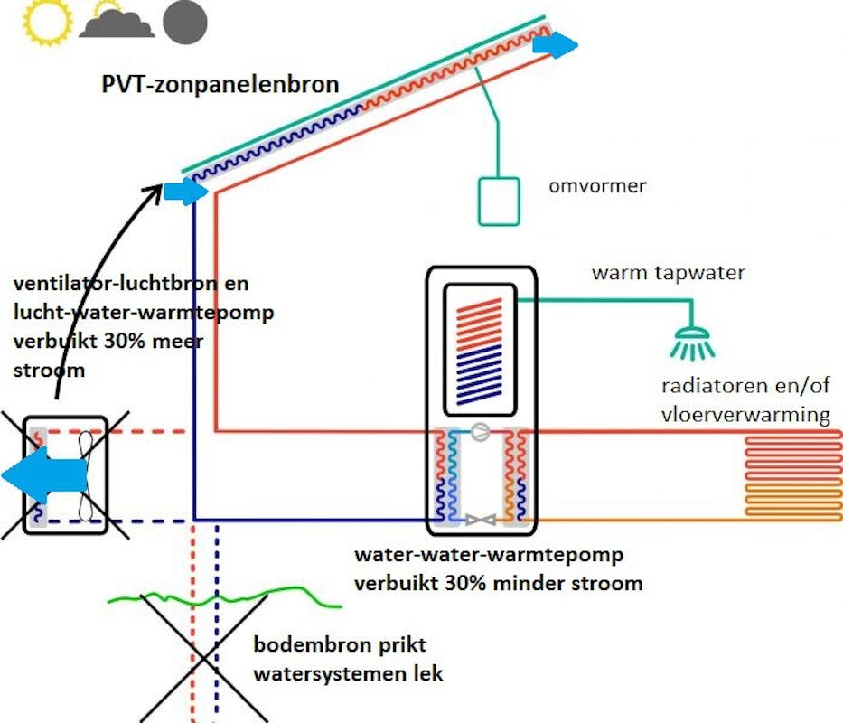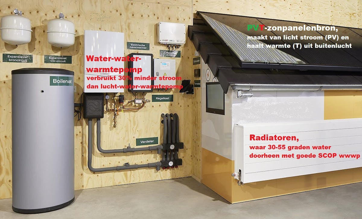 Gas besparen of gasloos verwarmen & koelen met stroomzuinigste water-water-warmtepomp en stille PVT-zonpanelenbron. Dit verbruikt 30% minder stroom dan lucht-water-warmtepomp met brommende ventilator-luchtbron en PV-zonnepanelen (bewijs van Instituut Gelijkwaardigheidsverklaringen en praktijkcijfers van eigenaren).