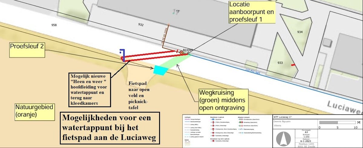 Het goede contact met deze hulpvaardige behandelaar bij Vitens leidde bij zijn bezoek donderdag 19 december op Locatie aan de Luciaweg tot een heuse doorbraak: Hij zag een mogelijkheid om vanaf de hoofdwaterleiding bij de brandkraan (Iets wat volgens de stadsbeheerders van de gemeente niet mogelijk was voor Vitens door het gebrek aan ruimte) op een acceptabele afstand een watermeter aan de zuidkant van de weg aan de oostkant van het fietspad aan te sluiten. En van daaruit het watertappunt aan de westkant van water voorzien. Er was voor het graafwerk bij de openbare weg en de noodzakelijke vergunningen, wel medewerking van de gemeente nodig, maar de man van Vitens zou begin januari formuleren welke medewerking hij van ons en de gemeente nodig had voor het Vitensdeel van dat watertappunt tot en met de watermeter plus wat er nog moet gebeuren voor de aanleg van het watertappunt.