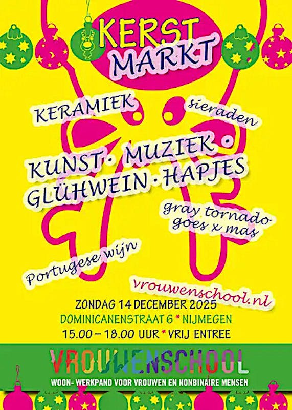 Kom naar de gezelligste kerstmarkt van Nijmegen-Oost, van 15-18 uur in de Vrouwenschool, Dominicanenstraat 6!